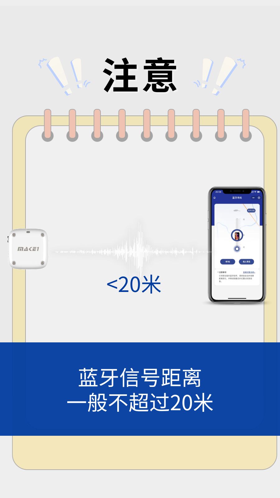 蓝牙信号有效距离一般不超过20米,无法穿透墙壁和金属。如果您在室内使用蓝牙寻物,请确保在每个房间门口停留10秒以上,以准确寻获信号。信号发射频率为两秒一次