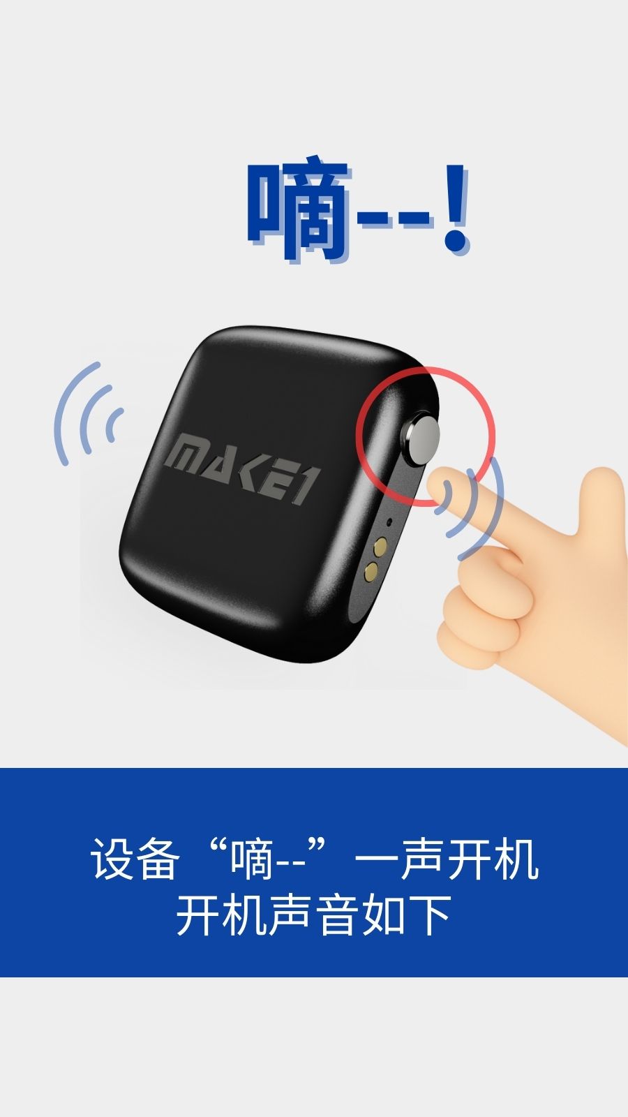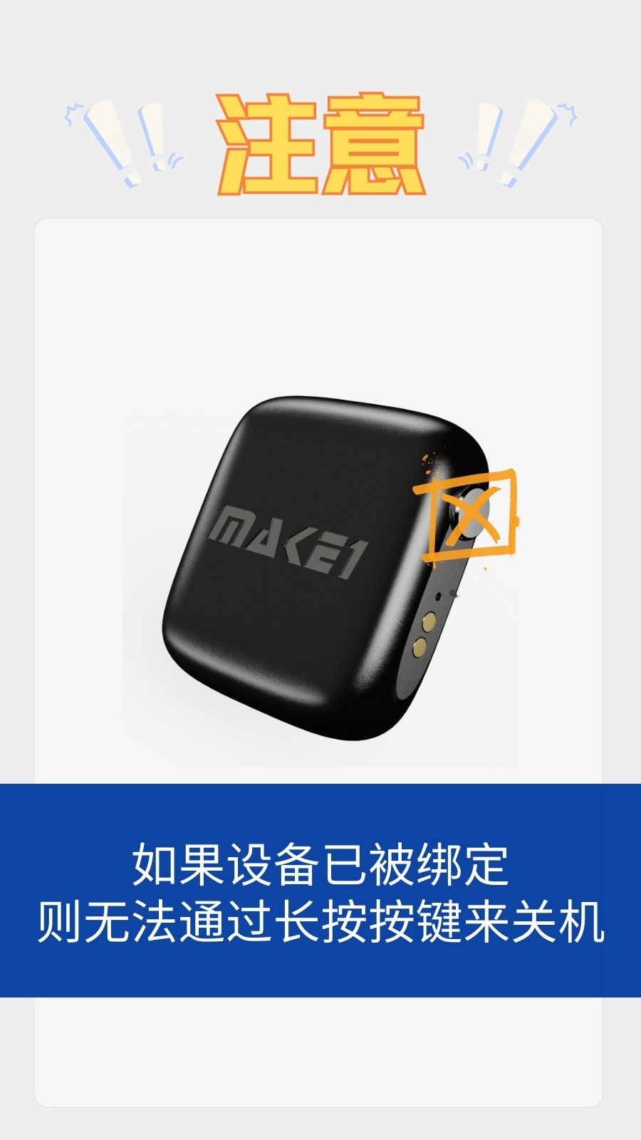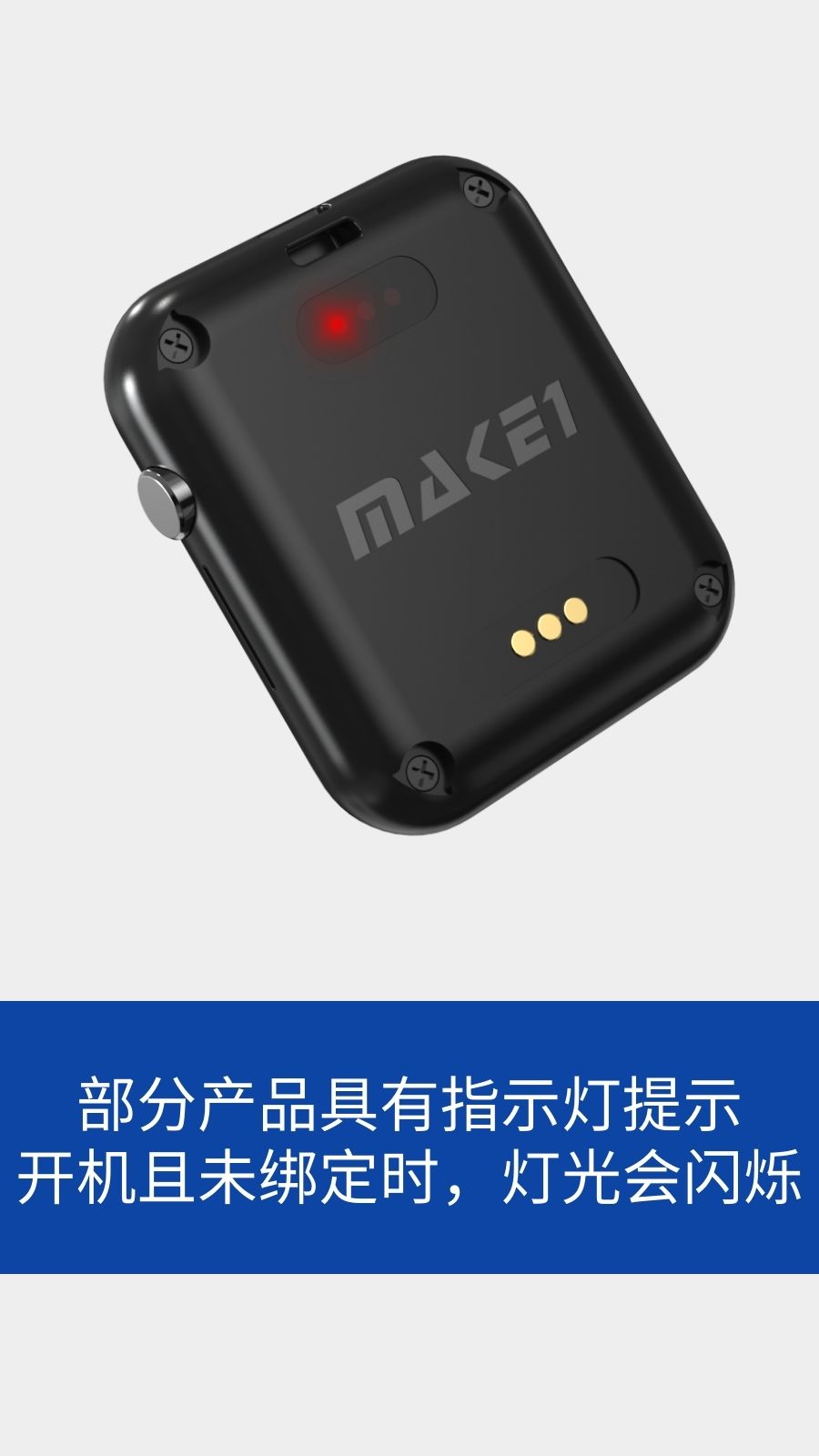 1.MAKE1 GPS设备均配备有一个独立按键,长按按键,设备”滴--“一声开机。部分产品具有指示灯提示,开机且未绑定时,灯光会闪烁。