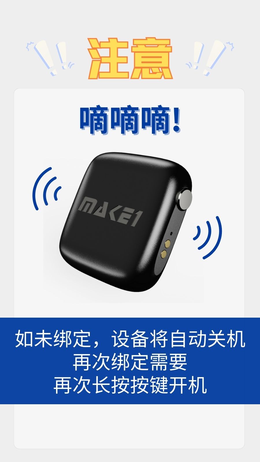 2.已开机、未绑定的设备,请在3分钟内绑定。如未绑定,设备将自动关机。再次绑定需要再次长按按键开机。