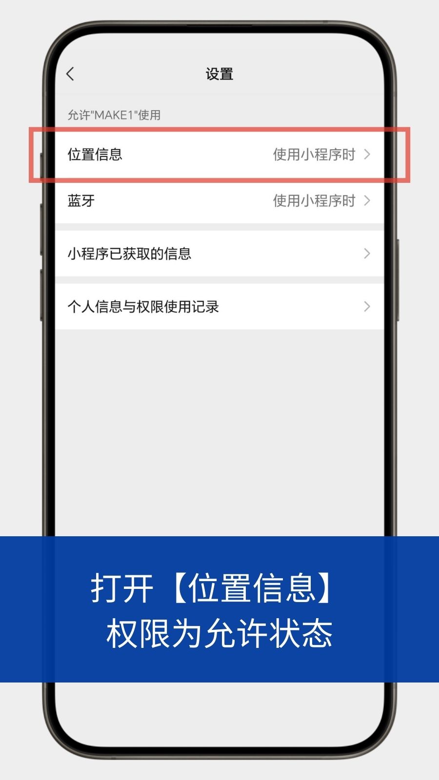 【定位权限】 如果您在使用MAKE1 GPS设备时小程序出现无地图显示或蓝色地图显示情况,需打开定位相关权限即可正常使用